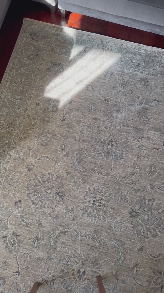 The border is quiet and understated, using slightly deeper ivory, pale beige, and muted grey tones. Floral details echo those in the central field, creating continuity rather than contrast.